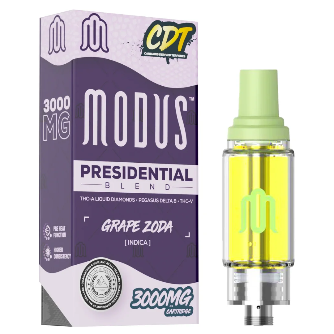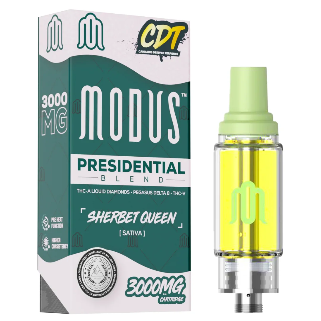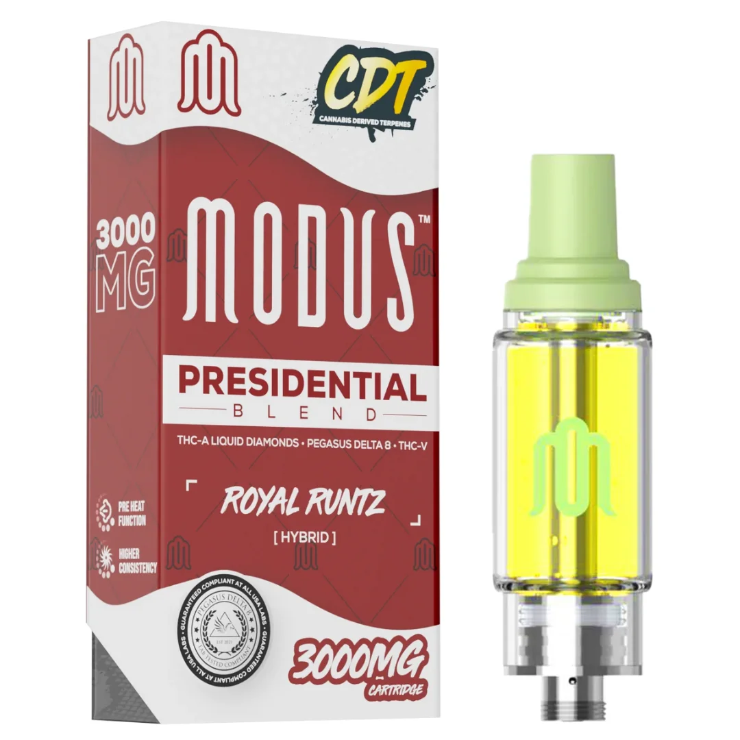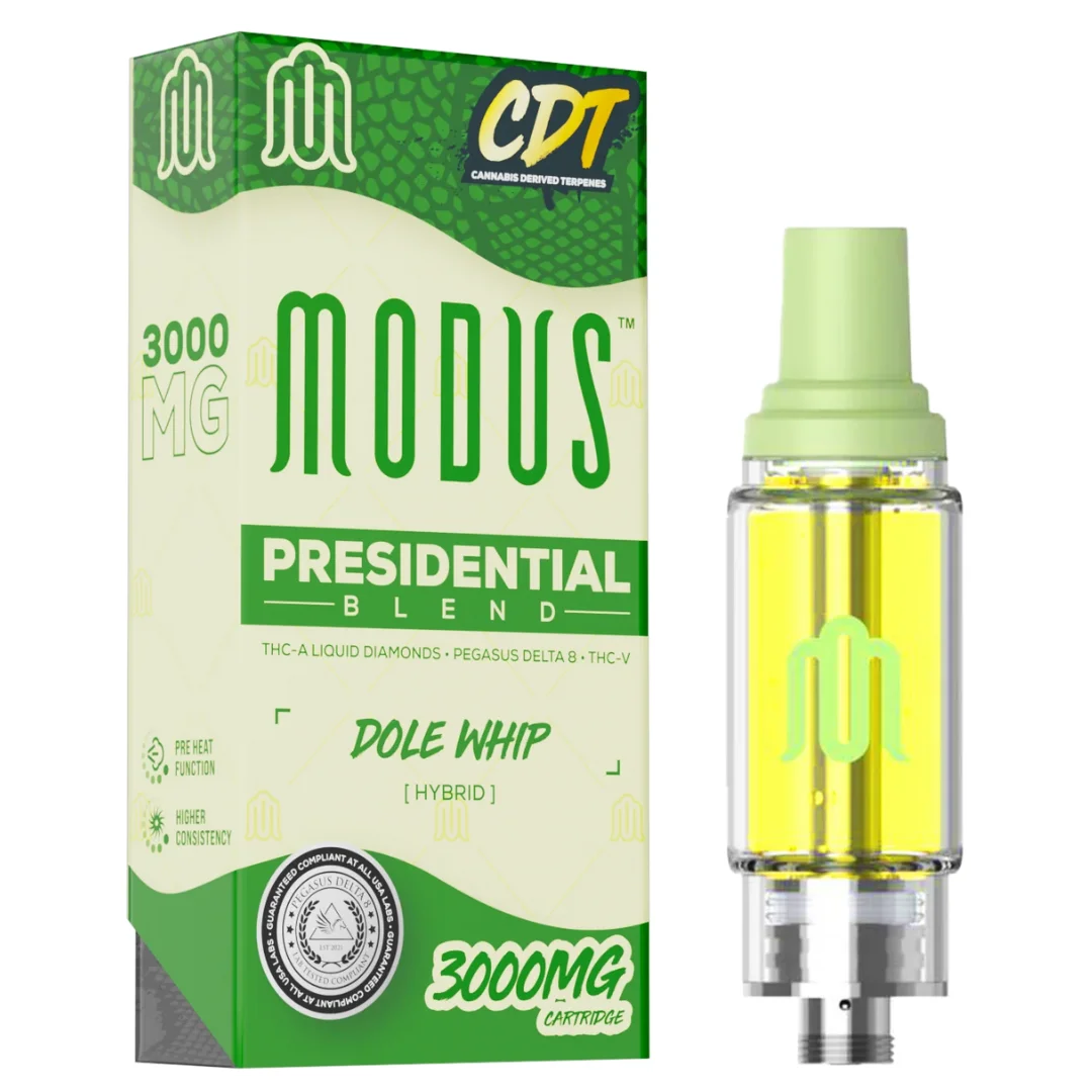 Indulge in the epitome of hemp luxury with the Modus Presidential Blend Cartridge. An exquisite fusion of premium cannabinoids designed to elevate your vaping experience to new heights. Crafted with meticulous attention to detail, this 3-gram cartridge boasts a symphony of cannabinoids, including THC-A Liquid Diamonds, D8, THC-V. And cannabis-derived terpenes (CDT), ensuring a truly unparalleled vaping sensation. Each draw delivers a harmonious blend of flavors and effects, captivating the senses and leaving you satisfied.